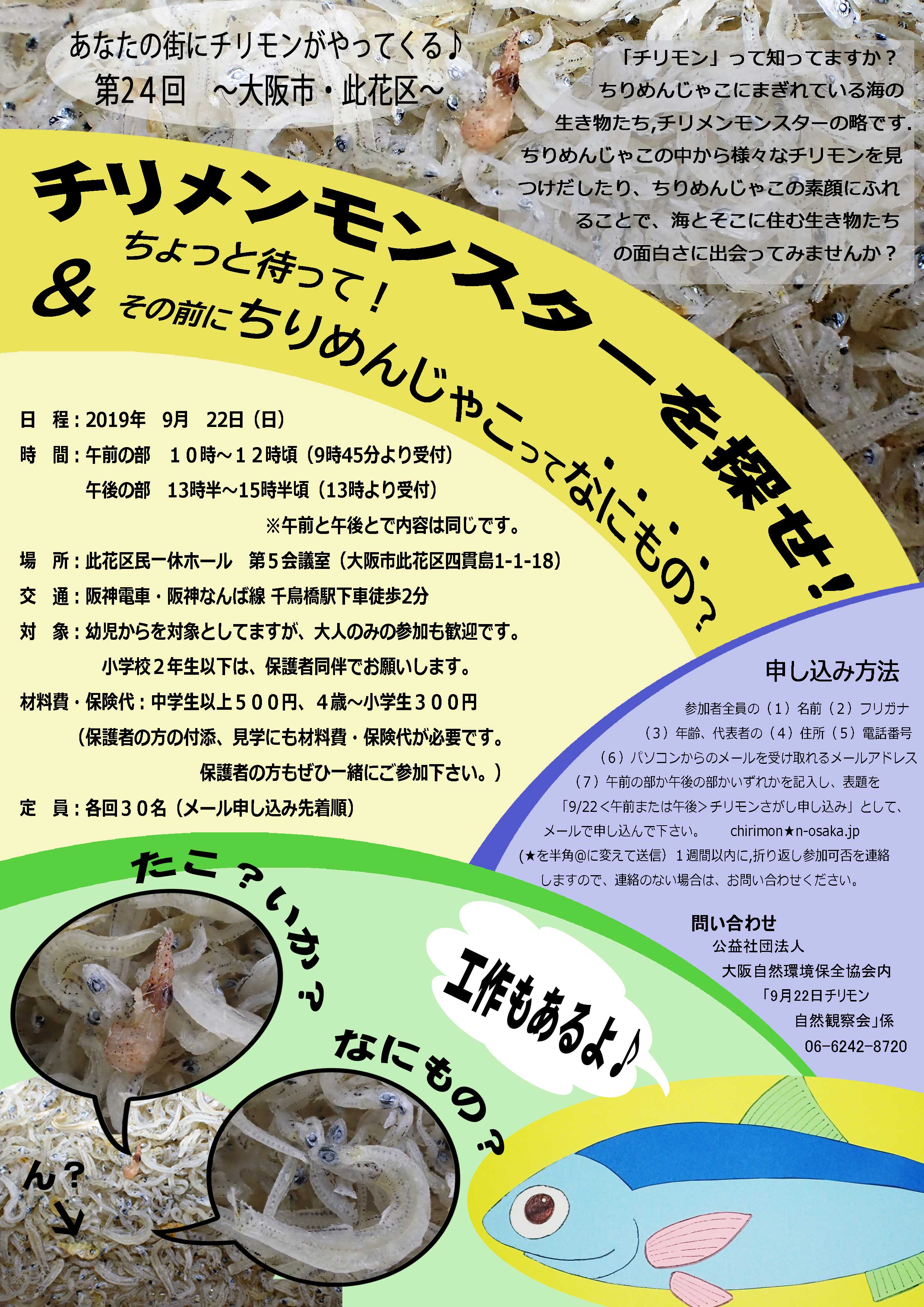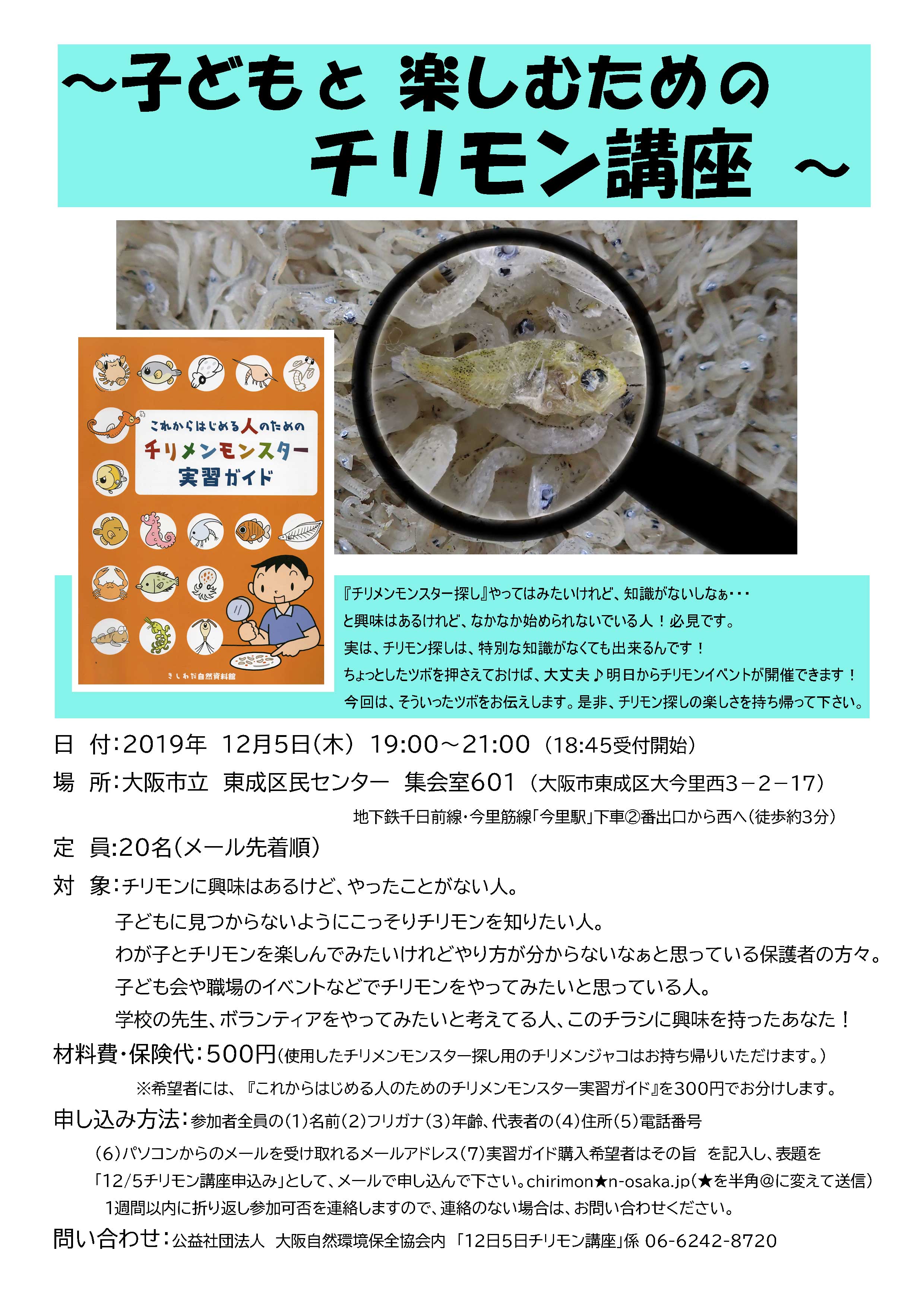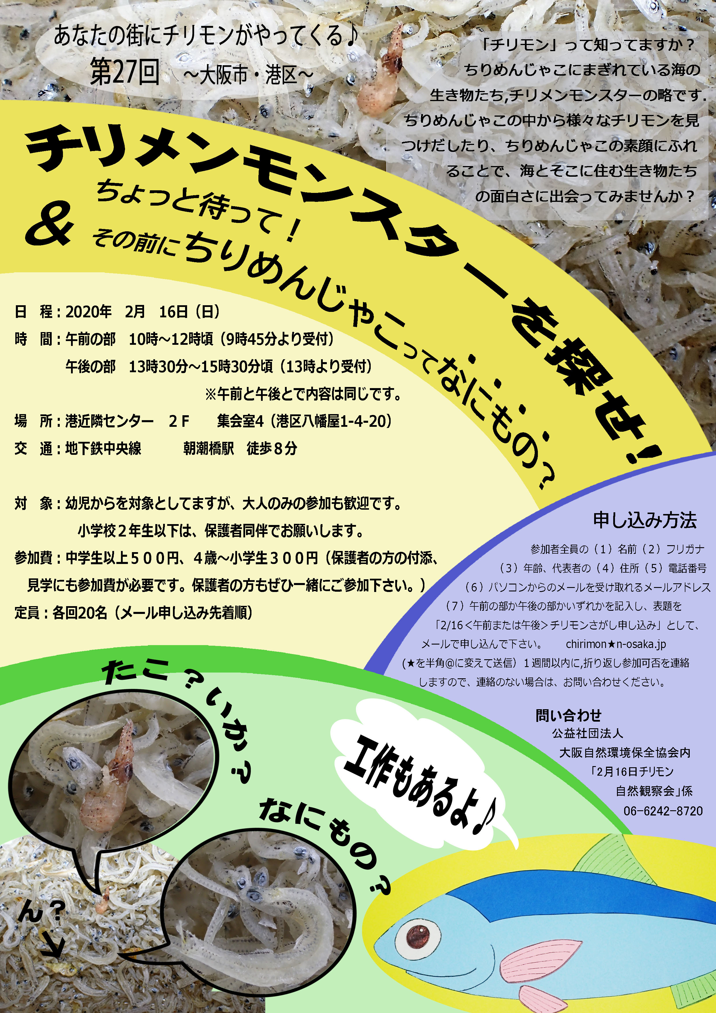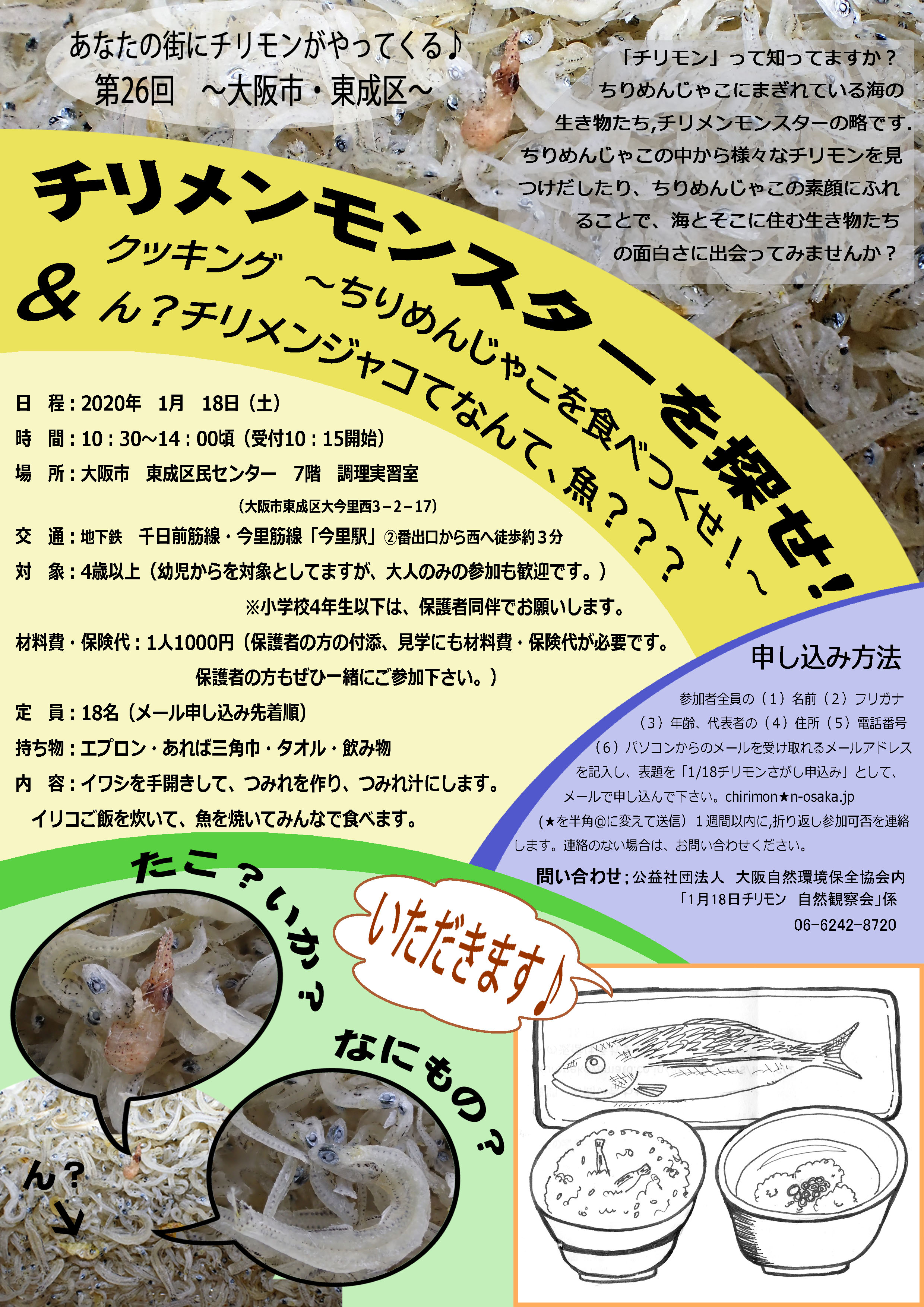 申し込み方法:参加者全員の(1)名前(2)フリガナ(3)年齢、代表者の(4)住所(5)電話番号(6)パソコンからのメールを受け取れるメールアドレス(7)午前の部か午後の部かいずれか を記入し、表題を「2/16<午前または午後>チリモンさがし申し込み」として、メールで申し込んで下さい。 chirimon★n-osaka.jp