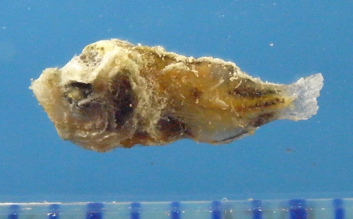 体はやや朱色がかった色をしています。頭はとても大きくて、全体の半分くらいが頭です。頭の中央には大きな眼があります。背びれから尾びれの間に白い斑が見えることがあります。